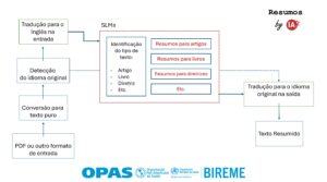 Na Figura 1 temos o fluxo de geração de resumos por Inteligência Artificial (by IA), iniciando com a conversão de documentos em PDF para texto puro, seguida da detecção do idioma original e, se necessário, tradução para o inglês. Esse processo de tradução inicial para o Inglês é necessário pois os modelos são otimizados para este idioma. Em seguida, um modelo de linguagem especializado identifica o tipo de texto (artigo, livro, diretriz etc), e partir disso é direcionado ao modelo especializado (fine-tuned) para cada tipo de texto. Por fim, o texto resumido é traduzido de volta para o idioma original, resultando em um resumo final padronizado, multilíngue e adaptado ao tipo de documento.